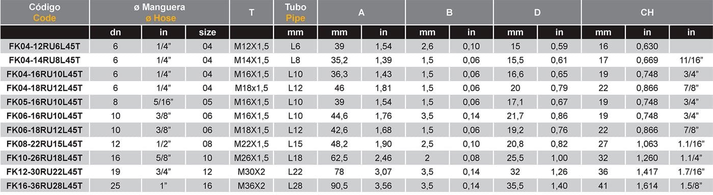 Hembra a 45º Métrica Cono 24º Serie Ligera