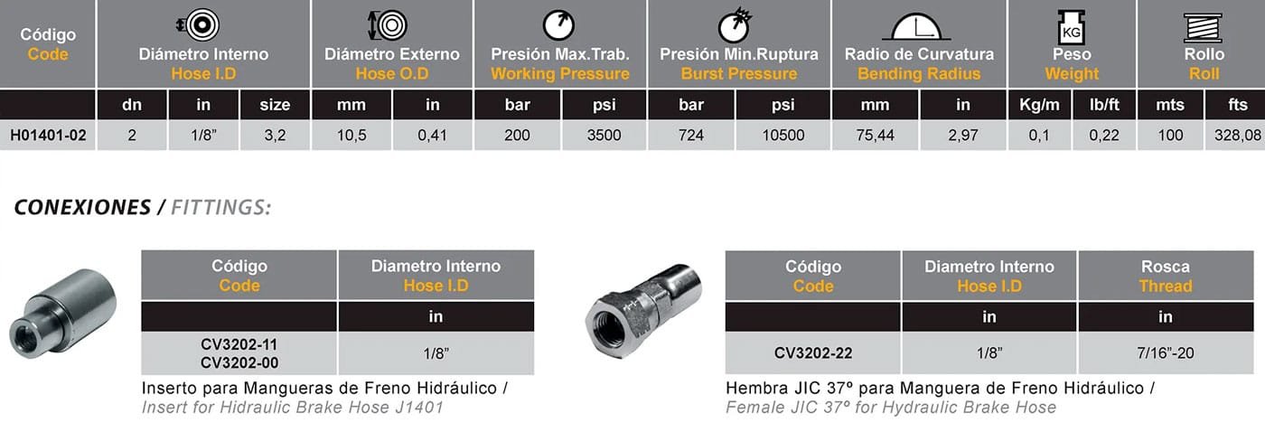 Líneas de freno hidráulico Rango de Temperatura: -40°C + 100°C Conexiones:CV3202-00, CV3202-11, CV3202-22