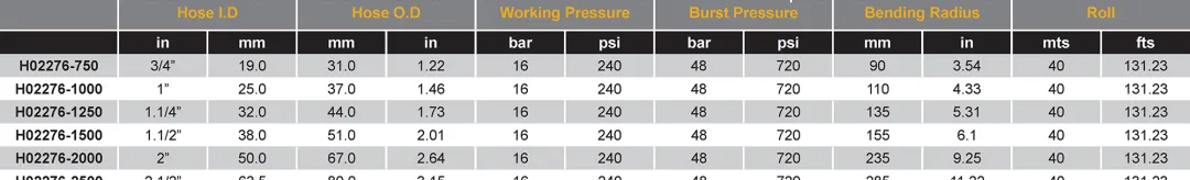 Tubo Interno: Polietileno entrelazado (XLPE) Refuerzo: Múltiples mallas textiles con alambre de acero helicoidal Cubierta: EPDM color verde