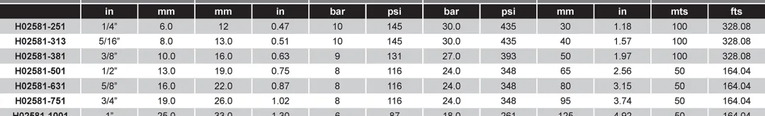 Distribución de alimentos y bebidas, agua potable, aire, líneas de respiración, envases y equipos, líneas de lubricación y otras aplicaciones que requieran inspección visual Rango de Temperatura: -5°C + 65°C