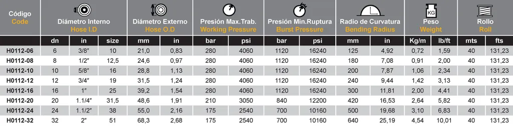 Tubo Interno: Mezcla de goma sintética de nitrilo-butadieno, resistente al aceite Refuerzo: 4 Mallas de acero espiraladas Cubierta: Mezcla de goma sintética resistente al aceite y la intemperie