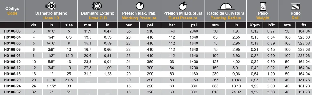 Tubo Interno: Mezcla de goma sintética de nitrilo, resistente al aceite Refuerzo: Una malla textil Cubierta: Mezcla de goma sintética resistente al aceite y a la intemperie
