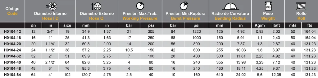 - Tubo Interno: Mezcla de goma sintética de nitrilo-butadieno, resistente al aceite,