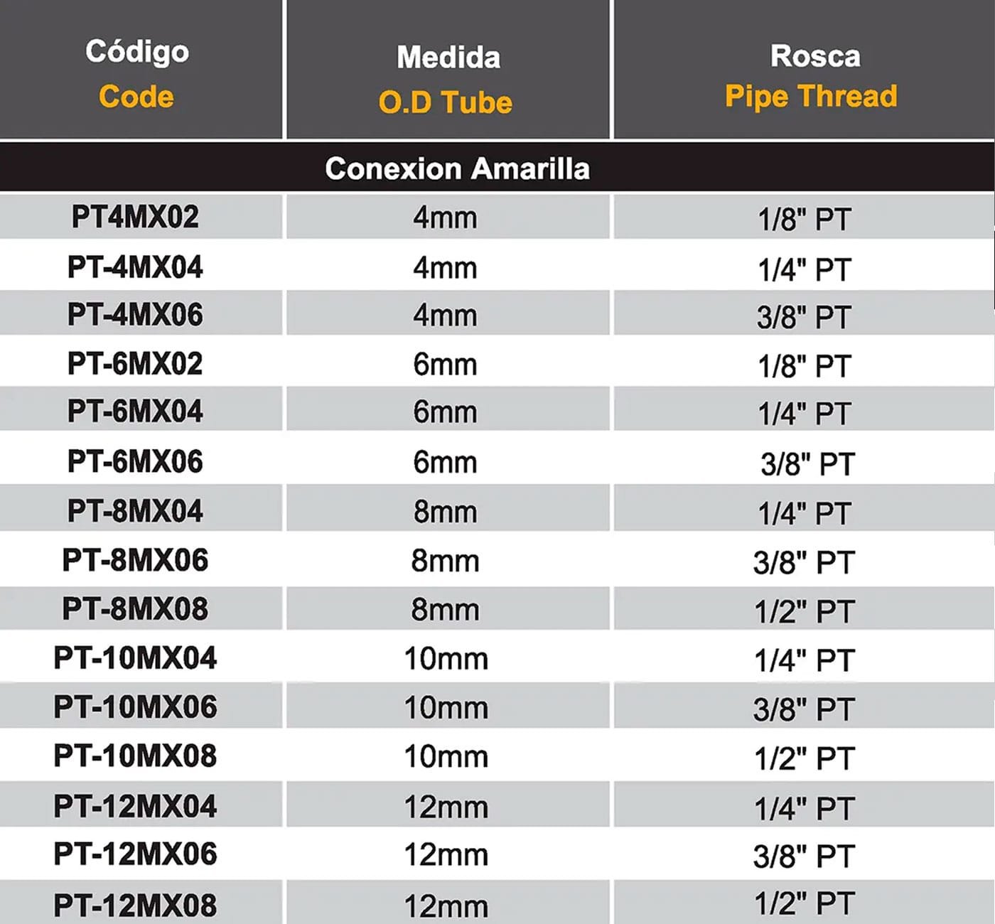 PT Push In Métrico, Macho Tipo «T» (mm x in)